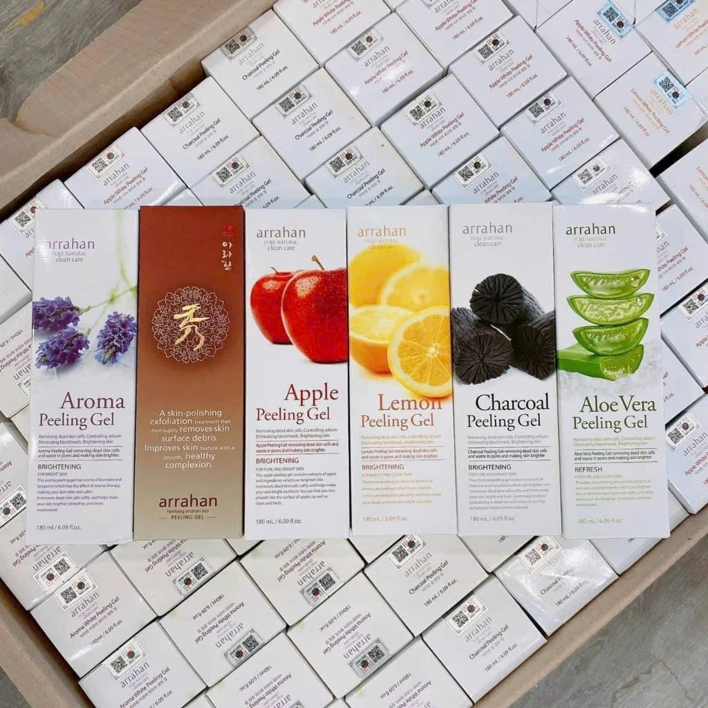- Gel C – Gel Tẩy Da Chết Làm Trắng Da Hoa Quả Arrahan 180ml: Kết hợp chiết xuất quả tự nhiên, AHA nhẹ (5%) và vitamin C từ cam, chanh. Sản phẩm chứa glycerin và chiết xuất lô hội giúp duy trì độ ẩm, phù hợp với người mới bắt đầu và da khô nhạt.